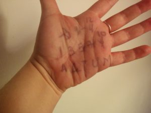 On 3.1.18 was our appointment to play. We arrived and waited some minutes. In the waiting room we saw an interesting sign with warning, e.g.: No panic, Safety first, No arms, No pets, …..